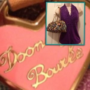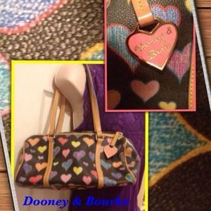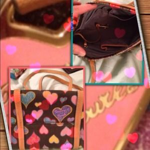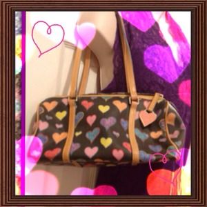 Multi- colored hearts are the theme for this Dooney & Bourke bag. 2 zippered pockets plus 3 pockets for phone and whatever else you need easy access to. Great bag!!