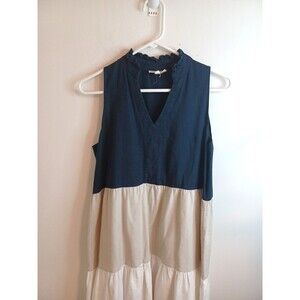 52 Seven Women’s M Linen Blend Color Block Navy Blue Tan White Tiered Dress