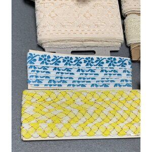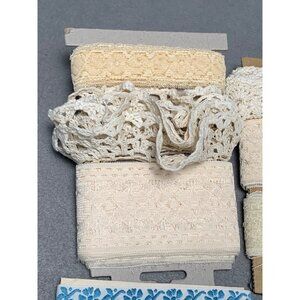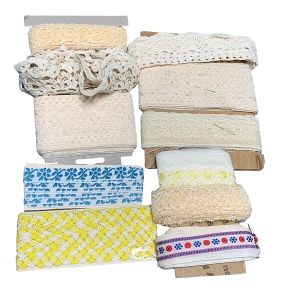 A collection of lace and trim in various colors and patterns for sewing and crafts.
