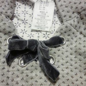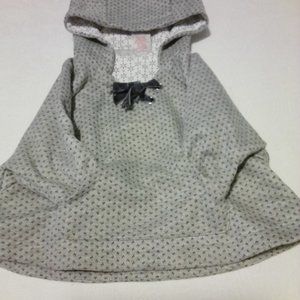 CUTEST LITTLE PULL OVER JACKET WITH HOOD.HAS SNAPS ON SIDE TO HELP PUT IT ON BETTER.HAS A FRONT POCKET HAS BLUR RIBBON TO TIGHTEN THE HOOD.THE COLORS ARE GRAY WITH BLUE DESIGN