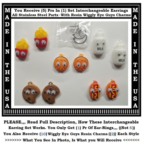 5/$20 Food Fun Wiggle Eye Interchangeable Snack Charm Earrings-5 Pairs in Set