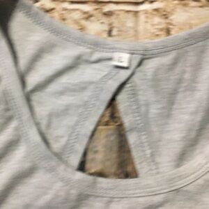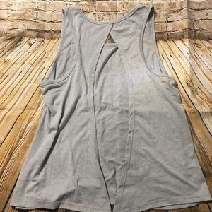 Women’s Gray Open Back Top Size Large new without tags. There is no material tag but feels to be a polyester blend.