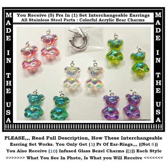 5/$20 Gummie Bear Dangle Candy Interchangeable Charm Earrings-5 Pairs in Set