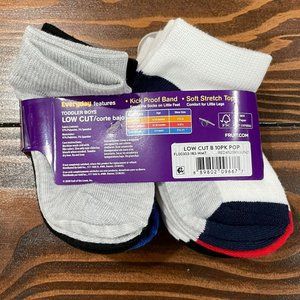 Fruit of the Loom boys 10 pack socks. New with tags. Low cut. Includes: 5 pairs are white w/ blocks of blue, black, gray, red & navy on toes & heels. 5 pairs are solid colors same as above minus white. Kick proof band-keeps socks on little feet. Soft stretch top-comfort for little legs. Inside indicators to easily match socks (see last pic). 97% polyester, 3% spandex. Ages 18-36 Months/ Size M. --------------------------- DDD