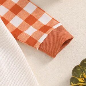 Fiona infants unisex one piece jumpsuit. New in package. Rusty orange & cream plaid sleeves. Cream waffle knit body. Rust orange cuffs. Embroidered Take Me To the Patch in black. 3D pumpkins in orange, rust & yellow with embroidered accents. 7 snaps on bottom. 65% cotton, 35% polyester. Size 12 Months. ------------------------- CC