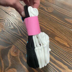 Gildan girls 6 packs cuff socks. New with tags. Soft ringspun cotton. Spandex for better fit. Includes: (3) white (1) black (1) blue (1) pink White socks : 72% cotton, 23% polyester, 4% elastic, 1% nylon. Colored socks: 74% cotton, 22% nylon, 3% spandex, 1% elastic. Shoe Size 4-10 (L). ------------------------- MM
