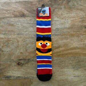 Sesame Street adult Bert and Ernie socks. New with tags. Crew. One sock has Ernie. Red, yellow, white & blue horizontal stripes. The other has Bert. Orange, blue & green vertical stripes. 98% polyester, 2% spandex. Shoe size 6.5-12. ----------------------
