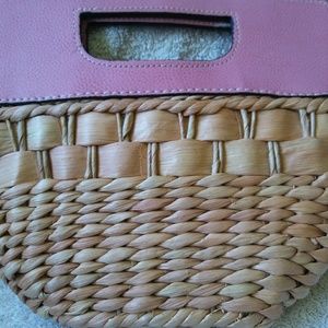 Very cute and adorable!! Small handbag that has 3" of pink on the top and the lower section is made from original corn husk. The front, upper center of the handbag, there is a small pink bow. The inside has pink fabric, covered in a variety of letters. The inside also consists of a small zippered pocket. In EXCELLENT condition. No stains or tears. Measurements are: