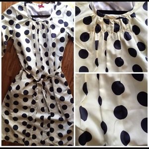This darling dress is 3/4 sleeve and about knee length. Please notice in the pictures that I accidentally damaged one small part of the sash. It's not noticeable when I'm wearing it, though. It's 100% polyester and machine washable.