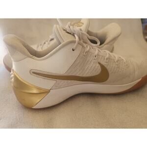 The product is a Nike Kobe A.D. sneaker in a white and metallic gold color scheme, featuring a low top shoe shaft style with a lace-up closure. It is designed for athletic activities, specifically basketball, and has a standard shoe width made of mesh upper material with a gum rubber outsole. This model, released in 2017, belongs to the Nike Kobe product line and is part of the Big Stage theme. The size 9 shoe is manufactured in Vietnam and is suitable for activewear or casual occasions.