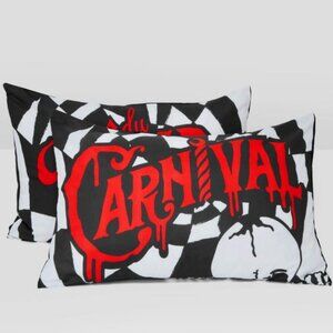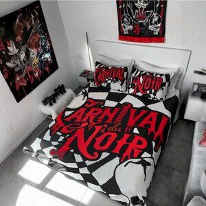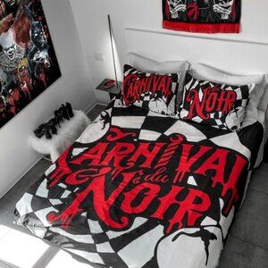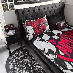 A rare deadstock set from Killstar’s Carnival du Noir collection, featuring the Queen bedding set w/ bold harlequin graphics & the matching Sideshow cushion pillow.