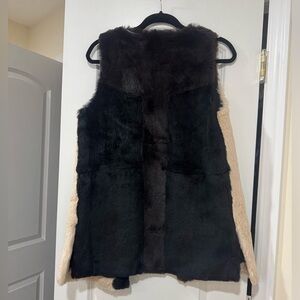 Chic Real Rabbit Fur vest with colorblock design. Features cream, brown, and black panels. Stylish and versatile.