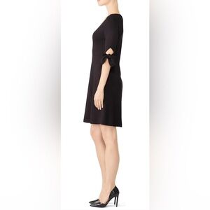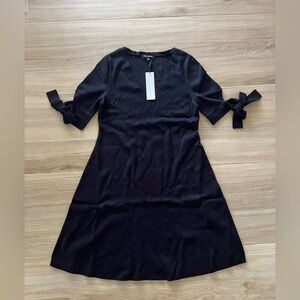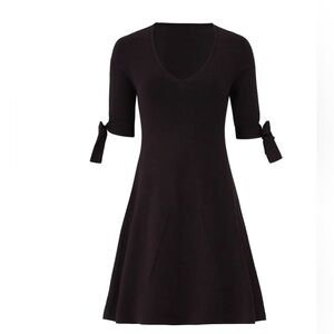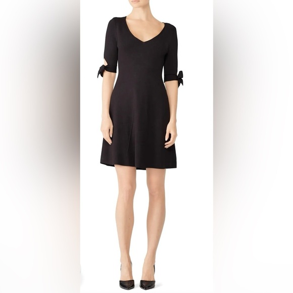 black fit and flare dress, V-neck cocktail dress, bow sleeve dress, black knee-length dress, little black dress, semi-formal dress, elegant black dress, women’s evening dress, tie sleeve dress, A-line party dress, classic black dress, date night dress, dress with bows on sleeves, flattering black dress, black dress for wedding guest