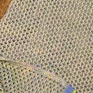 • Other information: Melange chunky knit tank top sweater vest. Scoop neckline. Sleeveless. Open knit design (see-through). Ribbed at neckline, sleeves, and hemline. Long length. Long side slits. The sleeves are rimmed with plain blue and green, but the rest of the tank top / sweater vest is an intricate complication of colored threads - green, blue, and pink. Minor stretch.