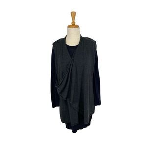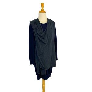 This unusual navy blue knee length sweater dress has a gray draped piece in the front that can either be attached by zippers to the shoulder or zipped onto the side for two different fun looks!
