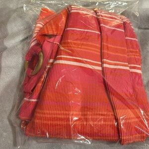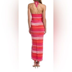 This sleeveless bodycon dress by 525 America features a striking pink color palette with a halter neckline with o-ring detail, perfect for resort wear. The stretchy material and fitted silhouette ensure a flattering fit, while the horizontal stripes add a touch of visual interest.