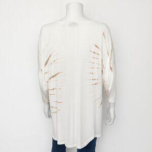 Pre-loved 525 America lightweight knit top in a neutral tan and beige tie-dye design. Features a relaxed dolman sleeve, scoop neckline, and high-low hem that’s shorter in front and longer in back. Perfect for layering with jeans or leggings for a comfy boho-chic look.