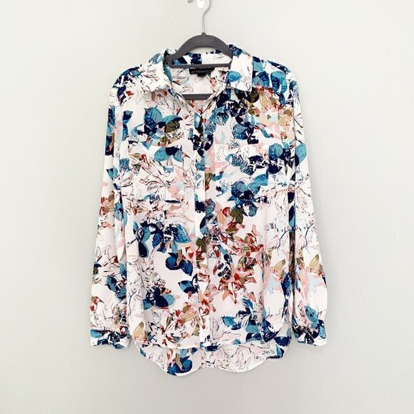5/$25 Attention bold spring florals lightweight flowy long sleeve collared top