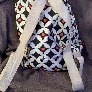 Audrey and Lewis backpack tote. Great for traveling, fits great under a plane seat and holds a lot of stuff! Could be used as a diaper bag as well. Easy to clean material! ?Cream, navy and coral pattern. Comes with a little clutch! Can be worn as a backpack.