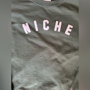 Champion ECO Authentic cotton blend forest green crewneck sweatshirt with NICHE written on chest.