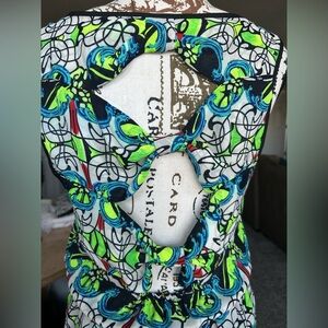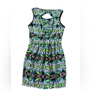 Color Block sundress in black and white abstract pattern with vibrant colors throughout. Open cutout back. Lightweight and easy to wear. Wearable Art. Skirt has a lining.