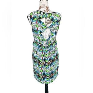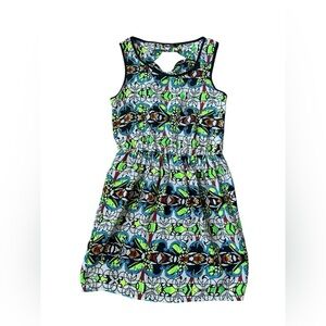 Color Block sundress in black and white abstract pattern with vibrant colors throughout. Open cutout back. Lightweight and easy to wear. Wearable Art. Skirt has a lining.