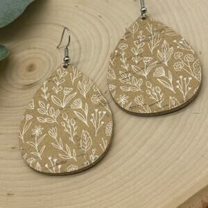 5/$25 Cork on Genuine Leather Tan Floral Teardrop Lightweight Earrings
