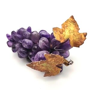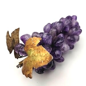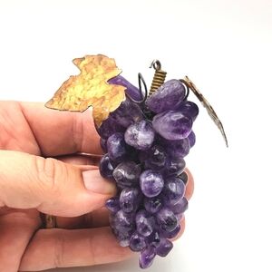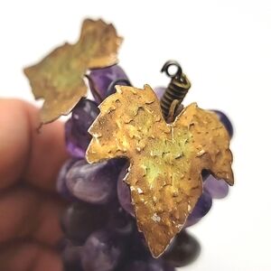 Beautiful purple crystal gemstone, amethyst grape cluster ornament with metallic stem and leaves. Gemstones measure from 6-11mm. Weighs 105 grams. Approx 3.5" tall. Perfect for home decor or as a unique gift.