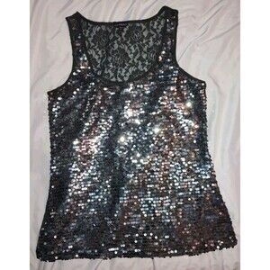 5/$25 EUC Sz M Sequin & Lace Sparkly Tank Top Express Grey & Silver