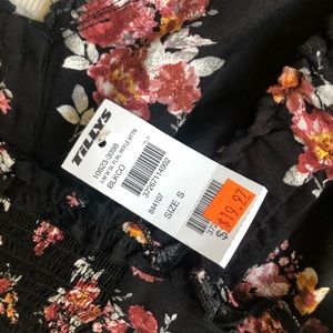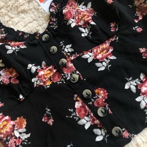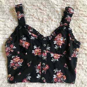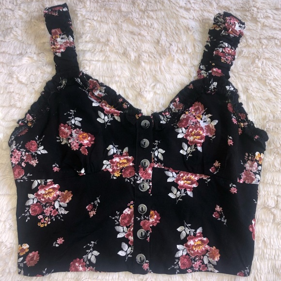 Full Tilt Floral Ruffle Button Cami. Woven crop cami with allover floral print. Fitted silhouette. Button front closure. V neckline with ruffle trim. Elastic ruffled shoulder straps. Smocked back panel. 100% rayon. Machine wash.