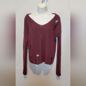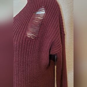Stylish distressed sweater in a rich burgundy color. Perfect for a casual look.