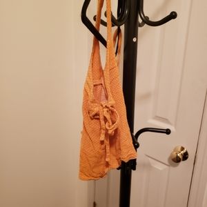 The top is mustard yellow with white polka dots. It has ties on each side and is cropped.