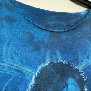 Stylish blue graphic t-shirt featuring a Jimi Hendrix design. Perfect for music lovers. Shirt is distressed, sleeves and neckline please see photos
