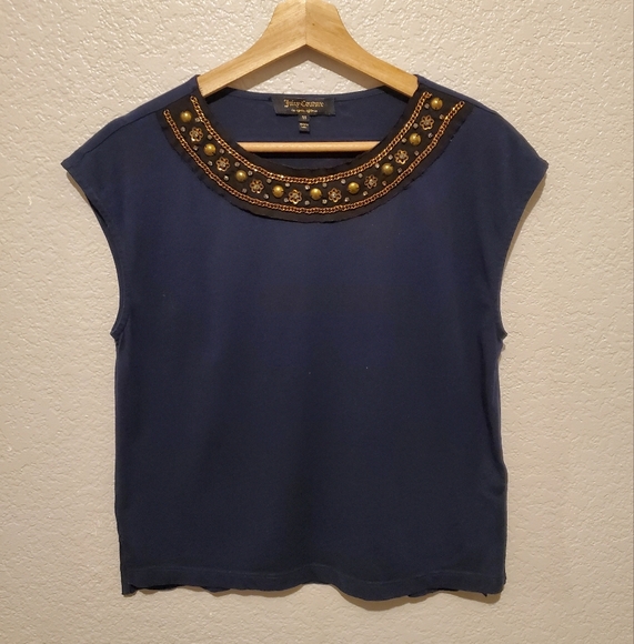 💚5/$25 Juicy Couture Embellished Neck Navy Blue Shell Top Size XS