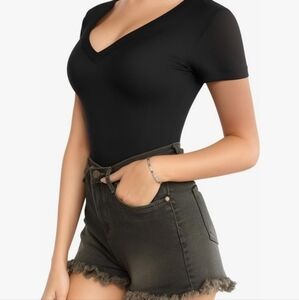💚5/$25 MangoPop Fitted Black Short Sleeve Bodysuit with Deep V-Neck Size Medium