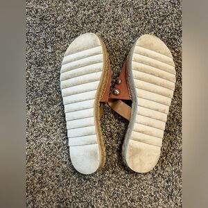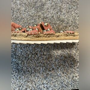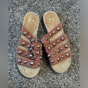 Marc Fisher mauve leather straps with woven sole and fun dramatic silver studs throughout. Slide on, easy to wear and adorable.