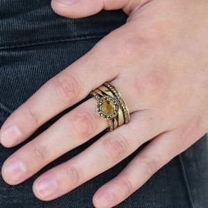 β€οΈβπ₯5/$25β€οΈβπ₯ A collision of glistening brass bands and aurum rhinestone encrusted bands stack across the finger. Featuring a glittery aurum rhinestone center, a brass hexagon frame crowns the top of the layered bands for an edgy finish. Features a stretchy band for a flexible fit.