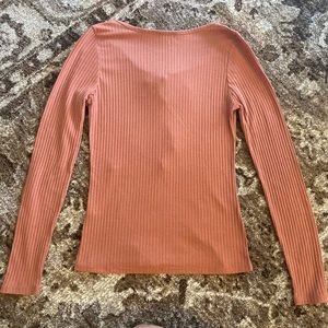 This shirt is very comfortable & cute. It is ribbed and has ties for the cutout on the top. Size Small.