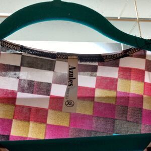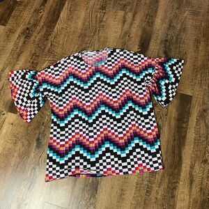 Azules Preowned Baloon Bell Ruffle Sleeve XL Lomg-line Tunic Top in Pristine Condition with Chevron Block Pattern Slinky Stretch Knit Fabric