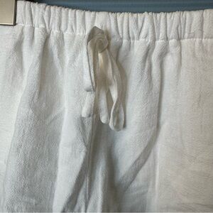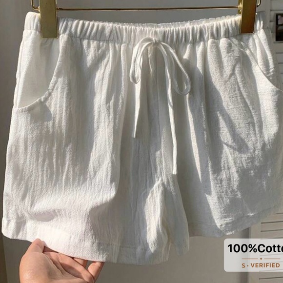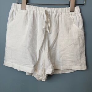 About Item: Pull on with a tie waist elastic waist comfy shorts. Pockets, lined, white gauzy linen feel to them. White. Relaxed in hips and legs. 100% Cotton. Machine Wash. size Small or a size 4. 5.5 ounces