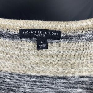 Signature Studio Black Tan Marled Striped Knit Scoop Neck Long Sleeve Sweater 1X. In good used condition with minor wear. No holes or stains. Side slits at hips for better movement. 55% Rayon 45% Polyester.