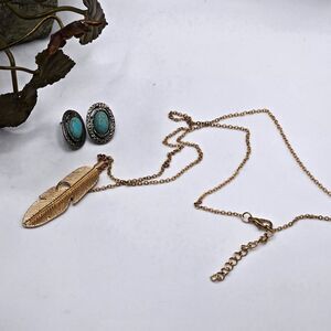 "5/$25" Southwestern Goldtone Feather Necklace/ Faux Turquoise Stud Earrings