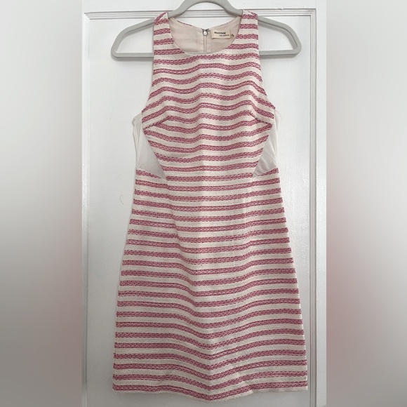 Classy chic dress featuring stylish pink and white stripes, sleeveless, mesh sides, and back zipper.