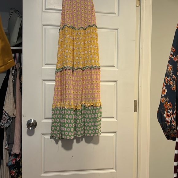 Charming dress with yellow floral print on a pink background. Sleeveless design. Perfect for a sunny day. #bohemian #boho #bohemianstyle #hippie #bohofashion #bohostyle #bohojewelry