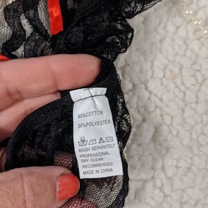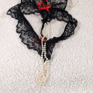 small black lace teddy with red bows and plastic pearl accents. never worn