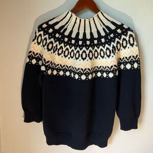 Beautiful Vintage 525 America icelandic, nordic, fair isle knit sweater. Mock turtleneck, 3/4 sleeves. Navy, pink and cream nordic pattern. Size large, but runs smaller. Please see measurements. Beautiful all over pattern. Excellent vintage condition. A few pulls that can be easily fixed. 50% cotton, 50% wool. Flat lay 25” L, P-P 17.5”. #fairisle #nordic #icelandic
