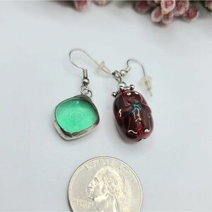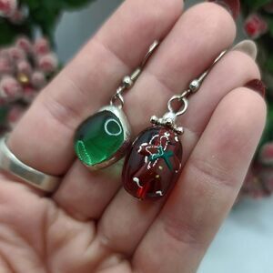 EUC, One is A Red Fused Art Glass Gingerbread Man Bead, The Other A Square Green Glass Bead, French Wire, Express your Unique Style with this Fun One of A Kind Pair!
