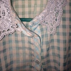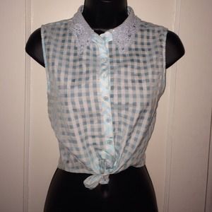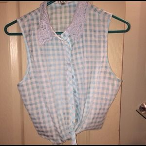 Worn once to a KEITH URBAN CONCERT !!Super cute blue and white plaid crop top . Button up and ties at the bottom. Adorable crochet detailed collar. Size medium Like new !if interested in this item please buy it on my Mercari user name @ambrd06. It's just like posh only they don't take20% and it's cheaper shipping , so it works for buyers and sellers :)
