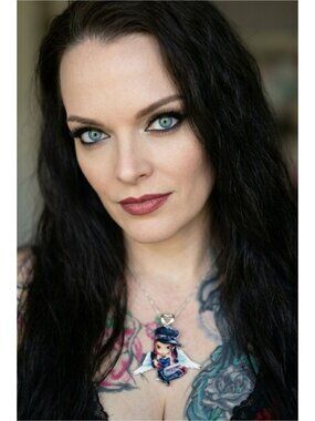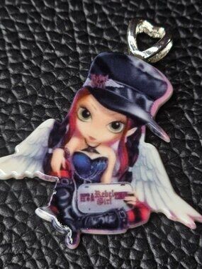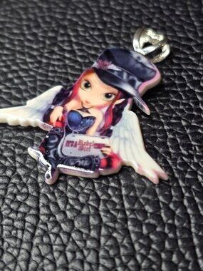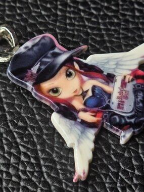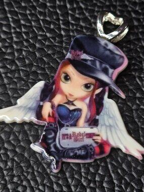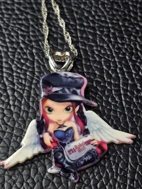 A whimsical rebel angel with wide expressive eyes takes center stage in this handmade acrylic pendant.