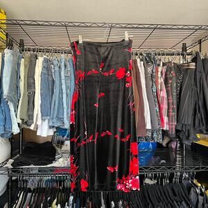 This gorgeous Y2K-era velvet mini dress is the perfect statement piece! Strapless design with a bold black + red butterfly & floral print gives it that true 2000s clubwear vibe. Features an attached beaded string detail that can be styled around the neck like a necklace or tucked in for a sleeker look. ✨